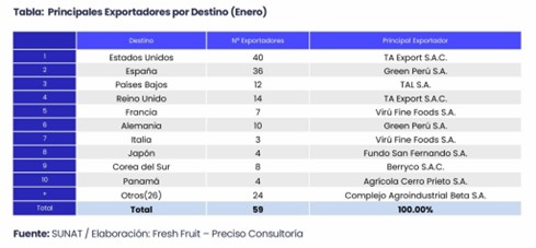 Señaló que, en el mes analizado, el espárrago procedente de Perú llegó a 36 destinos, uno mes que en enero de 2025. Además, se registraron 59 empresas exportadoras, tres menos que en el primer mes del año anterior.