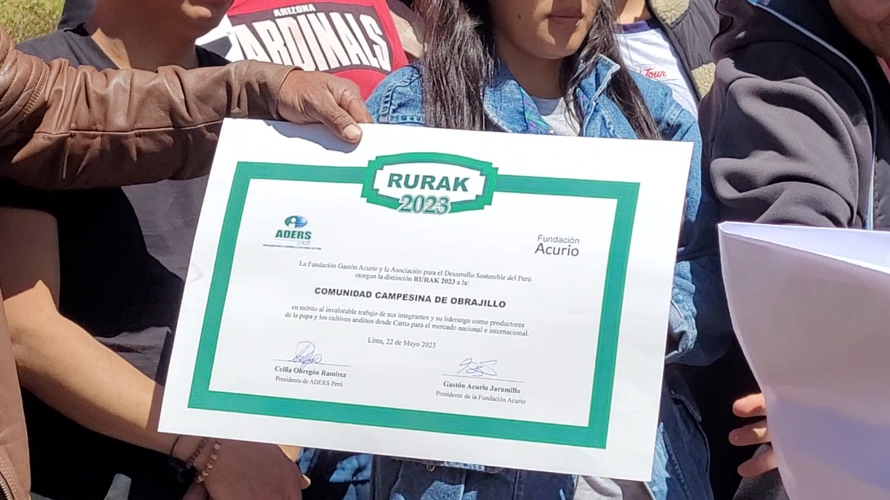 (Agraria.pe) La Comunidad Campesina de Obrajillo, ubicada en la provincia de Canta, al norte de Lima recibió el galardón "Rurak 2023", otorgado por la Fundación Acurio y la Asociación para el Desarrollo Sostenible del Perú (ADERS Perú).