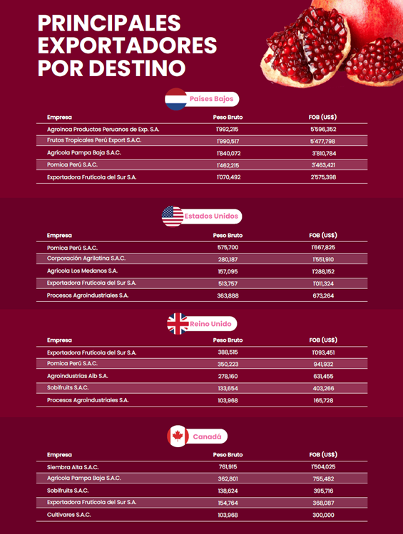 Resulta destacable que destinos como Canadá y los Emiratos Árabes Unidos hayan mostrado resultados sobresalientes. Canadá registró crecimientos cercanos al 42% en volumen y al 26% en valor; mientras que los Emiratos Árabes exhibieron un alza del 69% en volumen y del 77% en valor, siendo uno de los pocos mercados donde el precio aumentó casi un 5%. Aunque su participación sigue siendo reducida, la tendencia positiva de la demanda en estos destinos augura oportunidades de expansión para la granada peruana.