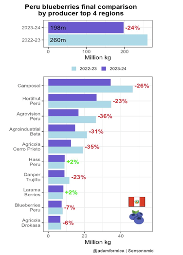 (Agraria.pe) Con la cosecha de arándanos casi finalizada en las principales cuatro regiones del Perú (La Libertad, Lambayeque, Ica y Lima), el total de exportaciones ha llegado a los 198 millones de kilos, lo que implica una caída de -24% con respecto a lo alcanzado en la temporada pasada (260 millones de kilos), informó Adam Formica, director científico de la empresa de tecnología agrícola Sensonomic.