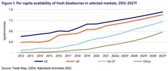 En respuesta al creciente interés de los consumidores por los arándanos en todo el mundo, la producción ha aumentado significativamente en los últimos años y se espera que siga subiendo. Como resultado, se prevé que la disponibilidad per cápita de arándanos en Estados Unidos supere los 1.5 kg anuales en 2027. Al mismo tiempo, se prevé que la disponibilidad de arándanos para el consumo en la Unión Europea y China experimente un aumento del 100% y del 200%, respectivamente, entre 2022 y 2027, como se muestra en el siguiente gráfico de Rabobank.
