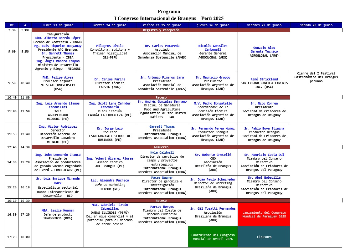 El congreso se realizará del 23 al 27 de junio de 2025 en la Facultad de Zootecnia de la Universidad Nacional Agraria La Molina, en Lima, y contará con la participación de destacados expertos nacionales e internacionales, quienes vienen, en su mayoría, en representación de las demás asociaciones y sociedades Brangus del continente para contarnos cómo se convierte una actividad en una industria pujante y de mucho potencial, que atiende tanto a sus mercados locales como internacionales.