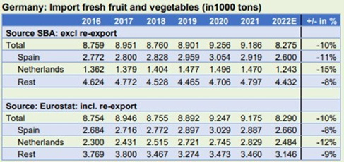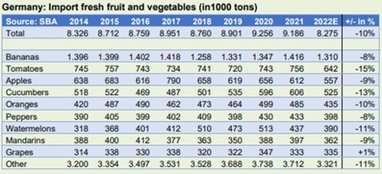 En 2019 y 2020, Alemania importó en torno a 3 millones de toneladas de frutas y hortalizas frescas españolas. Con 0.93 millones de toneladas, las importaciones desde Italia cayeron un 8% en 2022 (en 2021 fueron 1.01 millones de toneladas).