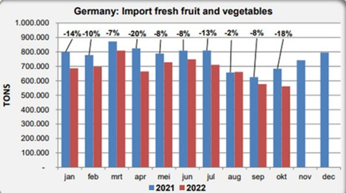 De enero a octubre del presente año, las importaciones se rezagaron un 11%. Se estima que la importación alemana de frutas y hortalizas frescas alcanzará los 8.3 millones de toneladas en 2022, cifra 10% menor que la del 2021 y también menor en comparación con los años anteriores.