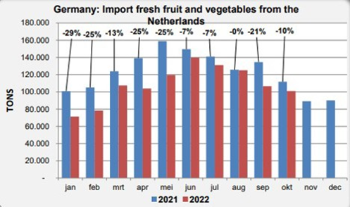 Las importaciones alemanas de productos hortofrutícolas cultivados en Países Bajos disminuirán un 15% en 2022 en comparación con 2021. La disminución de las importaciones totales desde Países Bajos es algo menor debido a que la reexportación de productos como bananas, uvas, aguacates y arándanos registró un crecimiento.