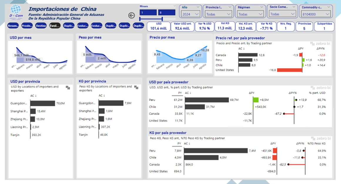 En la imagen se puede visualizar el resumen de evolución del monto en US$, Kilos, precio por Kg, localidad de registro de las empresas importadoras y países proveedores (socios comerciales).