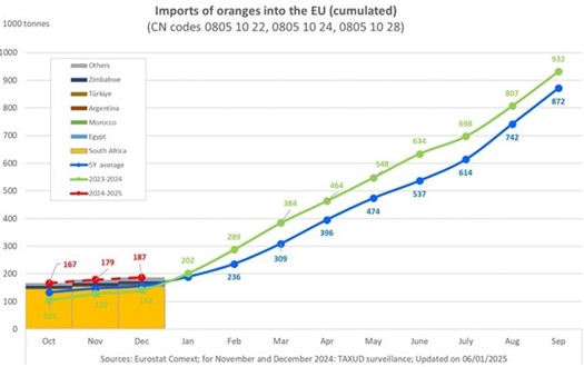 Las importaciones de naranjas de la UE alcanzaron las 187.168 toneladas de octubre a diciembre de 2024, lo que refleja un aumento de +41% en comparación con la media quinquenal para el mismo período.