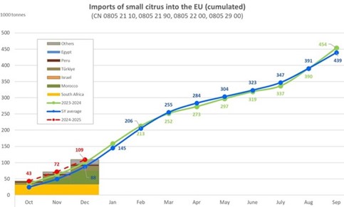 Las importaciones de clementinas y mandarinas totalizaron 109.362 toneladas durante el primer trimestre de la campaña 2024/2025. Marruecos fue el principal proveedor, con 41.657 toneladas, seguido de Sudáfrica, con 33.384 toneladas.