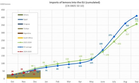 Las importaciones de limones disminuyeron a 54.949 toneladas entre octubre y diciembre de 2024, en comparación con las 67.616 toneladas de la temporada anterior para los mismos meses. Turquía siguió siendo el principal exportador, con 39.771 toneladas. Los precios medios de los limones bajaron a € 117 por 100 kg en diciembre, mientras que España e Italia mantuvieron precios más altos, de € 119 y € 122 por 100 kg, respectivamente.