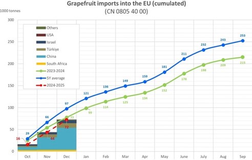 Las importaciones de pomelos alcanzaron las 72.195 toneladas durante el periodo de referencia. China lideró la cadena de suministro, exportando 50.835 toneladas, seguida de Turquía (10.633 toneladas) e Israel (5.411 toneladas). Los precios medios en toda la UE descendieron ligeramente hasta € 117 por 100 kg en diciembre, con importantes aportaciones de los proveedores de primera calidad que contribuyeron a mantener los niveles de calidad.