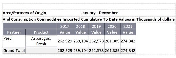 Clasificado como uno de los principales países de origen de espárragos frescos, las importaciones de esta hortaliza peruanas por parte de Estados Unidos representan casi US$ 274 millones anuales.