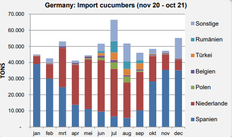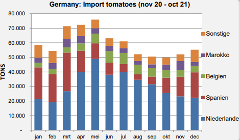 Las importaciones alemanas procedentes de los Países Bajos hacen referencia tanto a los productos producidos en ese país como a las reexportaciones. La Oficina de Estadística alemana basa las importaciones en el lugar de cultivo de los productos. Eurostat basa sus cifras de importación alemanas en el lugar de origen de los productos. Ambas fuentes indican menos importaciones de frutas y hortalizas frescas para los Países Bajos en 2021 que en 2020.