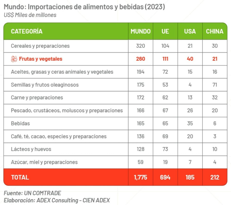 Detalló que sólo en la categoría de las frutas y vegetales, en el 2023, Estados Unidos realizó importaciones por US$ 111.000 millones, la Unión Europea por US$ 40.000 millones y China por US$ 21.000 millones. Para este año, dichos mercados alcanzarían los US$ 116.000 millones, US$ 42.000 millones y US$ 22.000 millones, respectivamente.