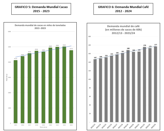 El café, el cacao y plátano, están entre los productos agrícolas más demandados del mundo y más bien es la oferta la que no está pudiendo alcanzar a la demanda en los últimos años, y, por otro lado, todo apunta a que esta demanda no se va a reducir, sino que se va a incrementar en el futuro cercano y con ello sus precios. La demanda (consumo) de cacao ha crecido a un ritmo de 2.8% anual entre el 2015 y el 2023, y en el caso del café al 1.7% anual entre el 2012 y el 2023[6], tal como se observa en los gráficos 5 y 6. En este contexto, es decir, con una demanda sostenida y precios al alza, ¿será suficiente un buen sistema de control para detener los incendios y la deforestación para ampliar áreas y sembrar más cacao o más café? ¿será posible resistir el embalse social por las expectativas que tendrán los pequeños agricultores para aprovechar los buenos precios? Creemos que no. Si no mejoramos la tecnología con la que hoy el productor trabaja su finca, un sistema de control enfrentado a una demanda creciente y precios altos o muy altos en el futuro cercano, fracasará.