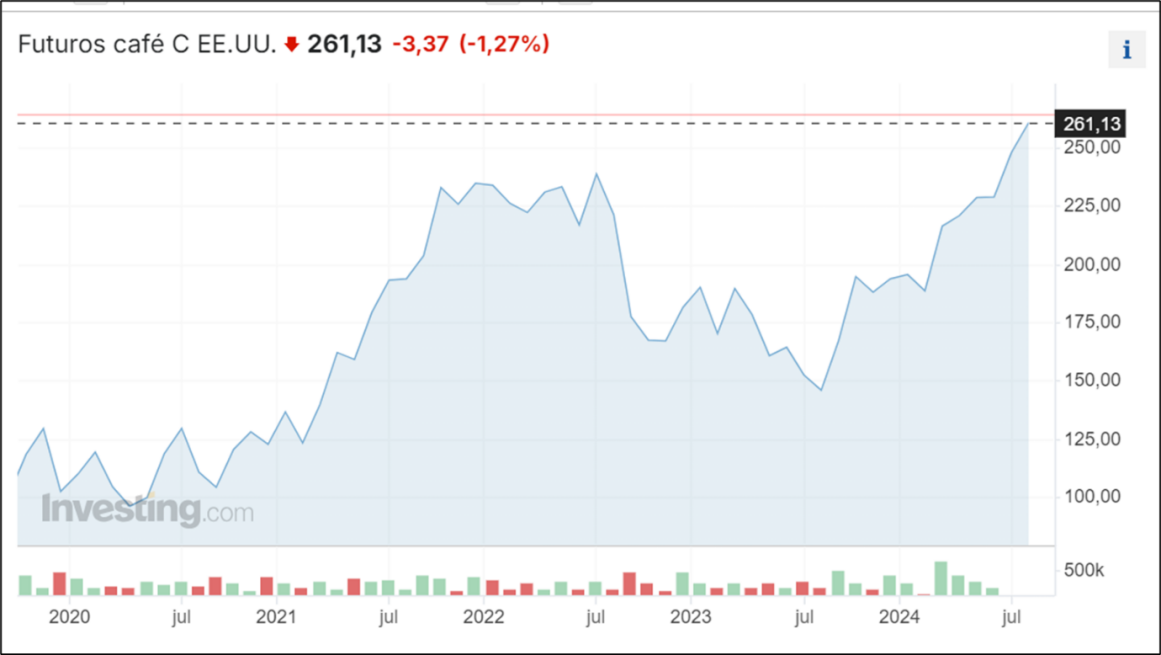 Tomado de Investing.com https://es.investing.com/commodities/us-coffee-c