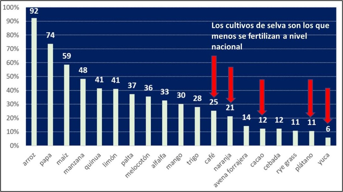 En el gráfico 7 podemos observar que de los ocho (8) cultivos que menos se fertilizan en Perú, cinco (5) de ellos son cultivos típicamente de la selva: café, cacao, naranja, plátano y yuca. El único producto que también se cultiva en selva y que es fertilizado en su mayor parte es el arroz (92%), gracias a ello, el Perú ocupa el tercer lugar entre los países con los niveles más altos de productividad en arroz a nivel mundial. Nuestro país alcanza un rendimiento productivo promedio de 8.100 kilos de arroz cáscara por hectárea, siendo superado solo por Estados Unidos, cuyo rendimiento promedio asciende a 8.700 kilos por hectárea y Uruguay con 8.500 kilos por hectárea[13].