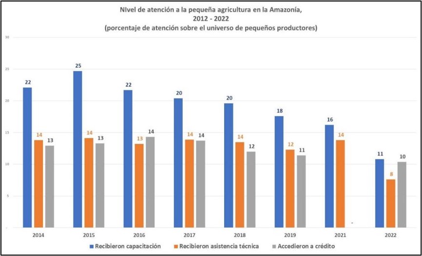 Es urgente que el Estado invierta en serio en aumentar la productividad de la pequeña agricultura amazónica si queremos acabar con la deforestación y con los incendios. En el gráfico 8 presentamos una serie de indicadores del nivel de atención a los pequeños agricultores en la Amazonía peruana entre el 2012 - 2022. Los datos no podían ser peores: los productores que reciben capacitación pasaron de ser 25% en el 2015 a ser menos del 11% en el 2022; el porcentaje de los agricultores que recibían asistencia técnica, que bordeaba el 14% en el 2014 y 2015, bajó a 8% el 2022; y, los productores que acceden a crédito, que llegaron a 14% en el 2016 y 2107, han bajado al 10%. El nivel de atención que vienen recibiendo los pequeños agricultores amazónicos no se condice con la importancia que hoy mas que nunca tiene la Amazonía para luchar contra el cambio climático, la mayor amenaza que tiene la humanidad en estos momentos.