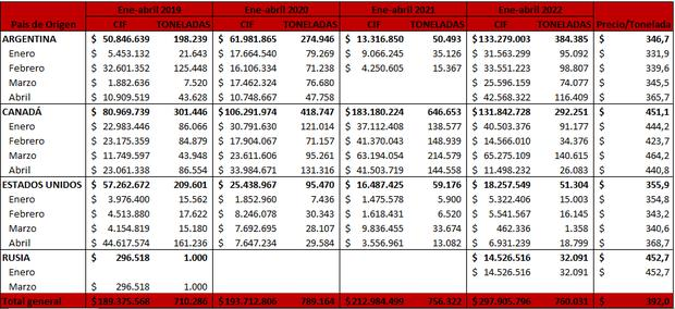 Entre enero y abril de este año, el ingreso de trigo a Perú registra un incremento de 0.5% respecto a similar período del 2021, totalizando así más de 760,000 toneladas, no obstante, en cuanto a valor CIF, el aumento es considerable (39.9%) explicado por la alta cotización internacional del cereal. (ver cuadro).