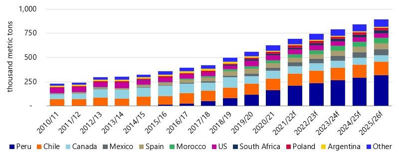 El analista senior de productos frescos de Rabobank, David Magaa, dijo que esperaba que las exportaciones globales en 2025/26 alcanzaran cerca de 900,000 toneladas métricas, con más del 70% proveniente de los cinco principales países exportadores: Perú, Chile, Canadá, México, España y Marruecos.
