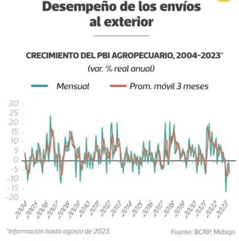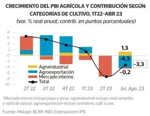 Luego de retroceder 4,6% durante la primera mitad del 2023, el sector agrícola continuó mostrando resultados negativos en el comienzo del segundo semestre. Si bien la producción orientada al mercado interno viene recuperándose gradualmente de la severa contracción registrada en meses previos, la agricultura ahora se encuentra afectada por los menores rendimientos de cultivos destinados a la agroexportación. Estos últimos concentran alrededor del 40% de la actividad agrícola y experimentaron una caída anual promedio de casi 10% entre julio y agosto del 2023, uno de sus mayores retrocesos de la última década, según estimaciones del IPE.
