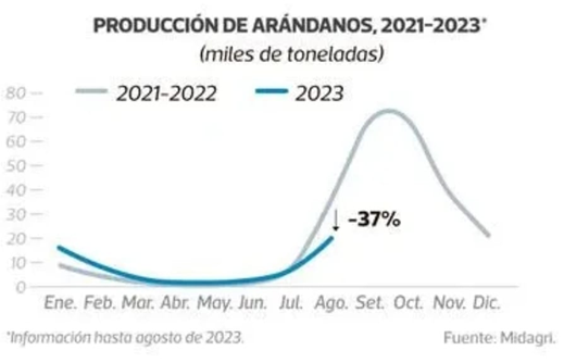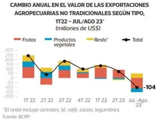 Las menores cosechas de estos cultivos se han reflejado en una caída anual en el valor de las exportaciones de frutas y vegetales de 14% y 25%, respectivamente, en julio y agosto. Ello equivale a una pérdida de más de US$115 millones en envíos de frutas, principalmente arándanos, y de US$37 millones en vegetales, como el espárrago. Con ello, el valor total de las agroexportaciones se contrajo 7% en dicho período, su mayor caída en 14 años sin contar el 2020.