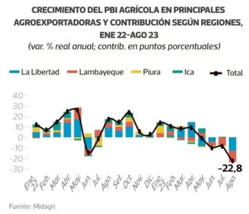 (Agraria.pe) Los choques climáticos continúan pasando factura a la actividad productiva del Perú. Uno de los rubros más afectados por las altas temperaturas registradas en el 2023 ha sido la producción orientada a la agroexportación. Eso viene causando millonarias pérdidas de envíos al exterior, así como una menor capacidad del sector para generar empleos formales y ser el motor de la recuperación económica de las principales regiones agroexportadoras. La mejora de la actividad agroexportadora hacia el 2024 dependerá de la magnitud del fenómeno de El Niño (FEN) en el verano, y de las políticas del Gobierno para incrementar la competitividad de este sector.
