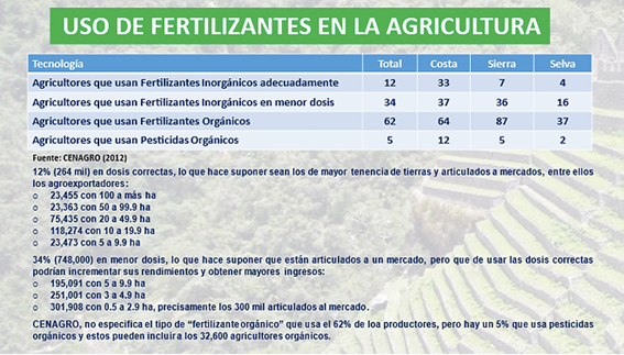 El abaratamiento del costo de estos, más un adecuado programa de capacitación, incrementarán hasta 46% los productores con dosis adecuadas, lo cual generará un incremento de su productividad (menor costo + mayor producción) en beneficio de sus ingresos familiares. Del total de productores que aplican abonos orgánicos (1’370,341), 74,8%, lo hacen en poca cantidad, y 25,2% (345,120) en cantidad suficiente: