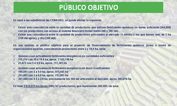 Los beneficios serán la eliminación de la intermediación para pequeños productores permitiéndoles incrementar rendimientos, la promoción y contribución a la asociatividad pues muchos se decidirán a integrar organizaciones dadas las ventajas en el precio del insumo, el fortalecimiento de las organizaciones agrarias, el aporte a la formalización de pequeños productores, su mayor acceso al crédito, y la mejora del clima social.