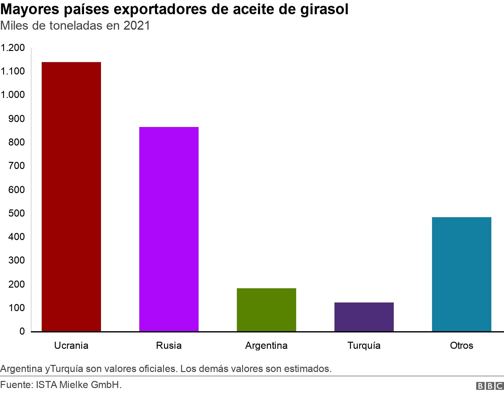 Conocidos como "el granero de Europa", Ucrania y Rusia concentraron el 71% de las exportaciones de aceite de girasol el año pasado, según la empresa especializada en análisis del mercado global del aceite ISTA Mielke GmbH, con sede en Hamburgo, Alemania.