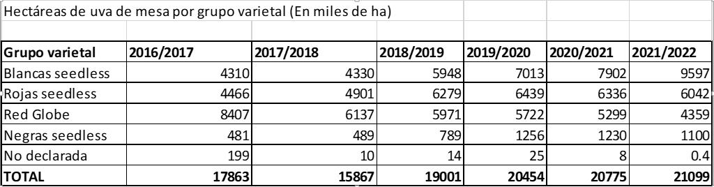 De acuerdo a la información de Provid, la campaña 2021/2022 cerró con un total de 21.099 hectáreas de uva de mesa, de las cuales 9.597 corresponden a hectáreas instaladas de variedades blancas. En un segundo lugar se encuentran las rojas seedles (o sin pepa) con 6.042 hectáreas, seguida de la que fuera hace años atrás la variedad estrella, Red Globe, con 4.359 hectáreas. El resto comprende a las negras (1.100 hectáreas) y un hectareaje mínimo que se desconoce en qué grupo varietal se encuentra.