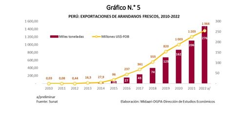 Entre el 2010 y el 2022, las exportaciones crecieron a una tasa promedio anual de 143,5% en volumen y 142,8% en valor. Cabe destacar que, a partir del 2019, el Perú se constituyó en el primer exportador mundial de arándano, lo cual se ha ratificó en el 2022.