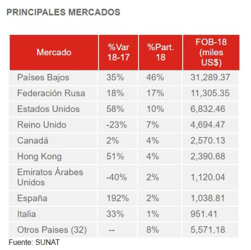 Según el Ministerio de Comercio Exterior y Turismo (Mincetur) y la SUNAT, la lúcuma llega actualmente a 41 países, siendo los mercados de mayor demanda Países Bajos, Federación Rusa y Estados Unidos. También ingresa con éxito al Reino Unido, Canadá, Hong Kong, Emiratos Árabes Unidos, España, Italia y otros 32 países.