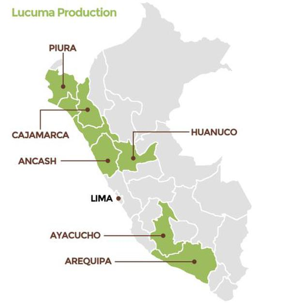 Las regiones donde se cultiva la lúcuma son Ayacucho, Áncash, Arequipa, Cajamarca, Huánuco, Moquegua, Piura y Lima. Sin embargo, en los valles de Cañete, Huaral, Huacho y Chincha, provincias del departamento de Lima e Ica, se produce la lúcuma de mejor calidad, al utilizar tecnología adecuada para producir frutos de alta calidad, con fines de exportación.