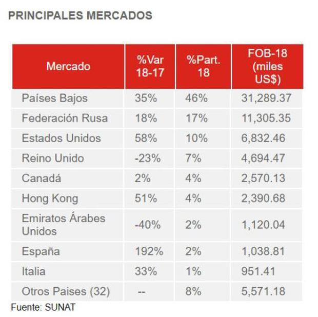 Las exportaciones peruanas de lúcuma ya llegan a 41 países del mundo, entre los cuales destacan los Países Bajos, Federación Rusa y Estados Unidos, informaron el Ministerio de Comercio Exterior y Turismo (Mincetur) y la Superintendencia Nacional de Aduanas y de Administración Tributaria (Sunat).