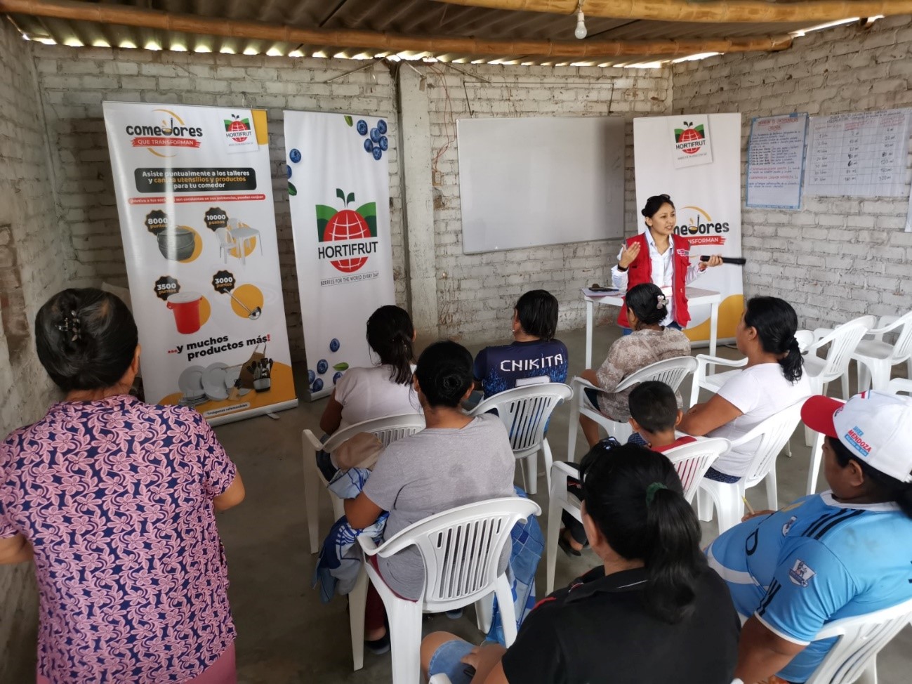 Las madres de comedores populares participaron en capacitaciones de varias áreas como: manejo de alimentos, administración y finanzas, empoderamiento femenino y manualidades. Las sesiones se enfocaron en el desarrollo de capacitaciones para la dirección y coordinación en la preparación de alimentos, manejo y propiedades nutricionales de los alimentos, entre otros. Como parte del apoyo integral de este programa, Hortifrut Perú también realizó donaciones de víveres y contribuyó con el mejoramiento de la infraestructura de los comedores.