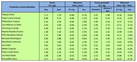 “Un abastecimiento superior en comparación al lunes 16 de enero se registró ayer en el Gran Mercado Mayoristas de Lima (GMML) en Santa Anita y el Mercado de Frutas 2 de La Victoria”, señaló.