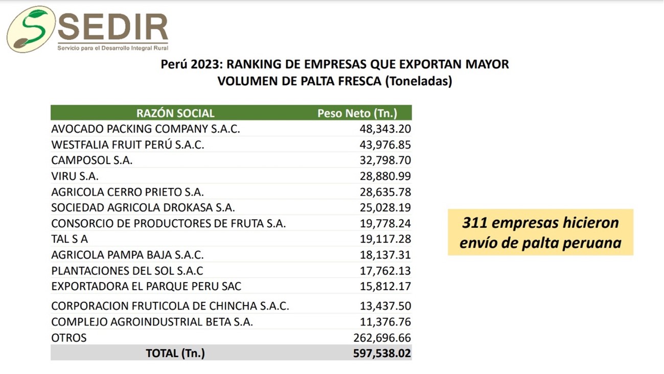 Avocado Packing Company S.A.C. fue la que más envíos realizó al mundo con 48 mil 343 toneladas; mientras que Westfalia Fruit Perú S.A.C. vendió 43 mil 976 toneladas; Camposol S.A. se ubicó tercera con 32 mil 798 toneladas; seguida de Virú S.A. con 28 mil 880 toneladas.