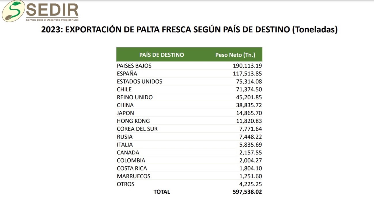 Sedir, institución que brinda soporte técnico a pequeños productores de Moro y Pamparomás en Áncash, también precisó que los meses de mayor exportación de palta son abril, mayo, junio, julio y agosto. Las principales regiones productoras son La Libertad, Lima, Lambayeque, Ica, Áncash y Piura.