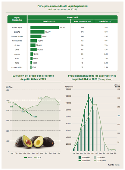 Entre los principales destinos de palta peruana, Europa continúa absorbiendo la mayor parte del volumen peruano, pero a precios más ajustados. Los Países Bajos han consolidado su posición como el mayor comprador de palta peruana, representando el 34% del valor exportado, seguidos por España con el 17% y Estados Unidos con el 14%.