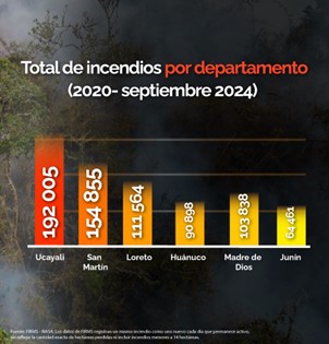 Entre enero y septiembre de 2020 a 2024, varias regiones de Perú han registrado altos promedios de incendios forestales. Ucayali lidera en incendios, con un promedio anual de 26.781 incidentes registrados entre enero y septiembre del 2020 al 2023, aunque en el 2024. Los meses más críticos han sido agosto (8.912) y septiembre (13.022).