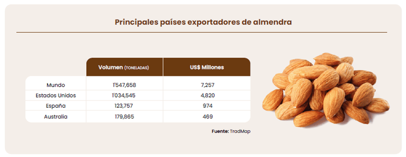 La almendra es hoy uno de los frutos secos más exportados en el mundo, con aproximadamente US$ 7.260 millones. La producción mundial se acerca a 1.5 millones de toneladas en la última campaña (2023/2024), con una tasa de crecimiento cercana al 3%. El principal exportador mundial es Estados Unidos, con US$ 4.800 millones exportados en el 2024 (66.5% de participación), seguidos por España con US$ 974 millones (13.4%) y Australia con US$ 469 millones (6.5%).