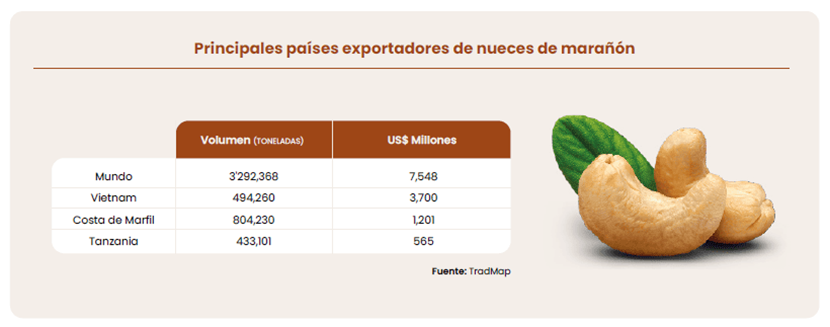 Las nueces de marañón (anacardos) son otro de los frutos secos más exportados en el mundo, superando los US$ 7.548 millones en el 2024. A diferencia de la almendra, este mercado no está dominado por productores estadounidenses, sino por países como Vietnam (49% de participación) y Costa de Marfil (16%). La cadena productiva se organiza en dos etapas: predominan pequeños agricultores, cuyos productos son acopiados por grandes agroindustrias como Olam o Vietnam Processed Foods, que se encargan del procesamiento y la exportación final.