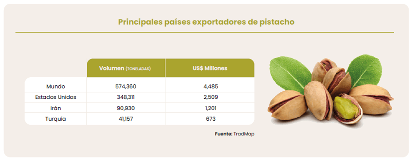 Otro gran producto en esta línea es el pistacho, que en la última campaña superó los US$ 4.485 millones exportados, de los cuales casi el 56% correspondió a Estados Unidos, seguido por Irán con cerca del 15%. China es el principal destino, con más de US$ 869 millones anuales. La demanda de este producto, al igual que la de otros frutos secos, continúa creciendo año tras año.