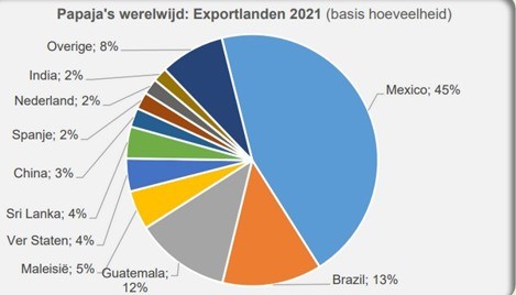 México es el principal exportador global de la mencionada fruta, seguido de Brasil y Guatemala. Luego, a cierta distancia, siguen Malasia, Estados Unidos (sobre todo reexportación), Sri Lanka, China, España (exportación y reexportación) y los Países Bajos (solo reexportación).