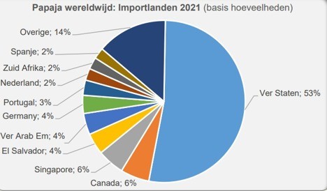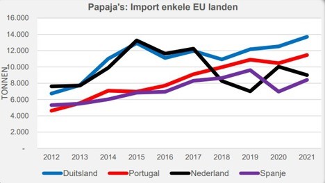 En 2022, las importaciones holandesas desde Brasil disminuyeron en un 40%, aunque Países Bajos sigue siendo el segundo mayor importador europeo de papayas brasileñas. También los envíos a Alemania, España y Francia disminuyeron. Italia, en cambio, aumentó sus volúmenes de importación, aunque las cantidades siguen siendo relativamente pequeñas. Teniendo en cuenta la tendencia de los primeros 9 meses, las importaciones europeas de papayas brasileñas ascenderán a aproximadamente 30.000 toneladas en 2022. Esa sería la cantidad más pequeña desde 2016.
