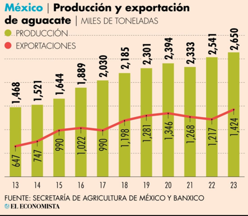 Paralelamente, las exportaciones de palta de México totalizaron 1.4 millones de toneladas en 2023, lo que supone 17% más en comparación con el año previo.
