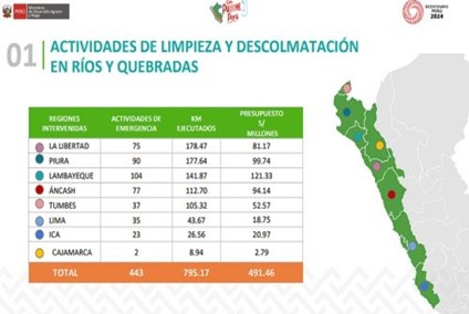 Los trabajos de descolmatación se han llevado a cabo en las regiones Tumbes, Piura, Lambayeque, La Libertad, Áncash, Cajamarca, Lima e Ica.