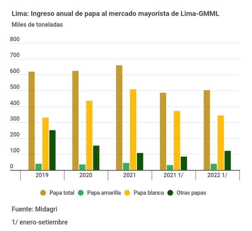 Mientras que en el período de enero a septiembre del 2022 el volumen de ingreso de la papa blanca declinó 7.5%, siendo compensado con el aumento del ingreso de la papa amarilla en 25.7% y el de las otras variedades de papa en 43.4%.