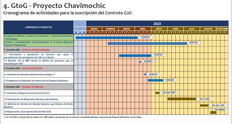 Agregó que se ha solicitado la demanda presupuestal adicional ante el pliego y, a su vez ante el MEF, para contar con los recursos necesarios para la estructuración del proceso de GtoG de la obra de Chavimochic. La indagación de expresiones de interés a estados extranjeros es un proceso que ya se inició esta semana y se está terminando el 19 de mayo.