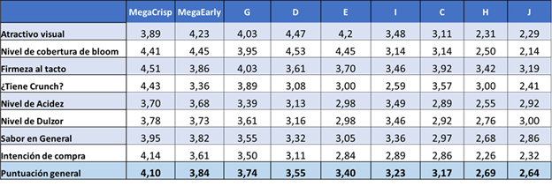 Para finalizar la actividad, los asistentes participaron de un panel test de 2 variedades de IQ Berries, MegaCrisp y MegaEarly, en donde se evaluó su calidad sensorial. La actividad fue una evaluación a ciegas, en la cual participaron 9 variedades en total y se votó por su atractivo visual en el clamshell, percepción de firmeza al tacto, nivel de cobertura de Bloom en los frutos, sensación de Crunch, nivel de acidez y dulzor al consumir los frutos, percepción de sabor en general, y la intención de compra de cada variedad. A continuación, los resultados de este Panel Test.